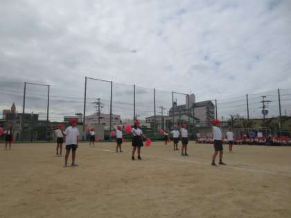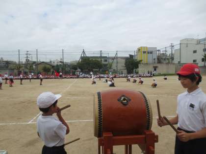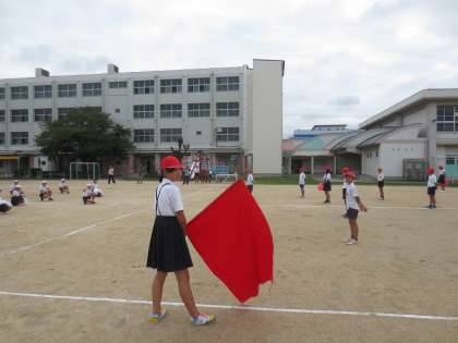 赤組の応援練習です。しっかりと太鼓をたたき、応援旗を力強くふり、響きわたる声で赤組の応援をリードしています。