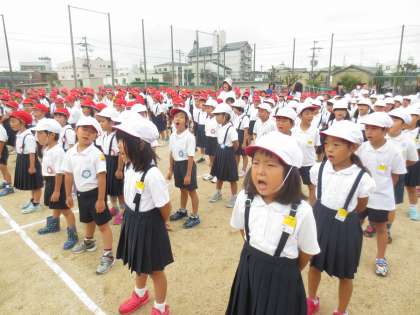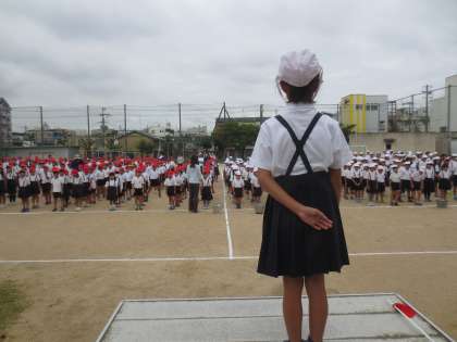 開会式に歌う「校歌」と「運動会の歌」の練習です。係の児童が朝礼台に立ち指揮をしています。