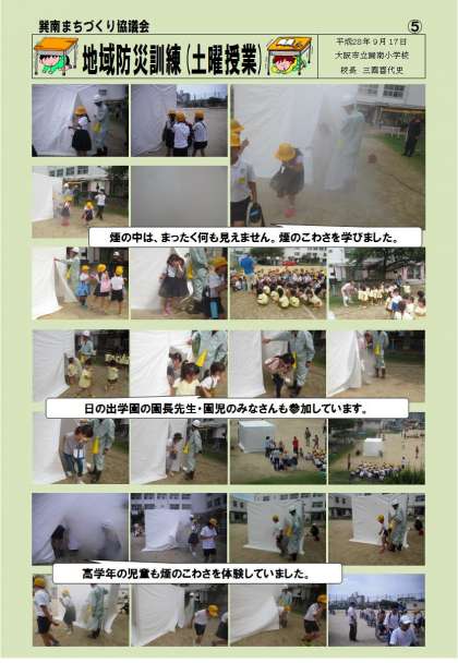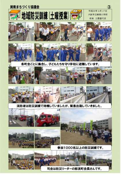 巽南まちづくり協議会理事長 川端千鶴男さんを中心とする巽南地域の方々と、小学校・中学校、消防署・区役所が連携し、防災訓練を実施しました。1000人以上が参加したこの取り組みを通して、子どもたちは、自分で守る「いのち」、協力して守る「いのち」、その「いのち」の大切さを学びました。ご協力いただいた皆様、ありがとうございました。