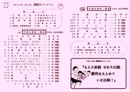 平成28年度 第45回 運動会プログラムを配布いたしました。児童会で話し合った運動会のスローガンは、「もえろ赤組 せめろ白組 いざ出陣」です。10月2日(日)午前9時開会です。子どもたちの応援に、保護者の方々、地域の方々のたくさんの来校を期待しております。右記の配布文書にもプログラムを載せております。