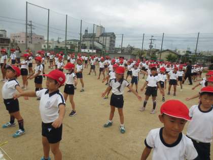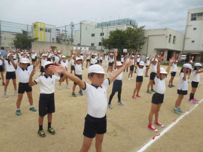 係り児童が前に立ち、ラジオ体操をリードしています。