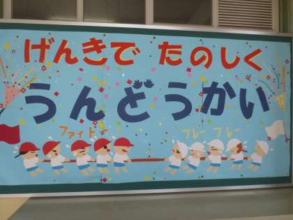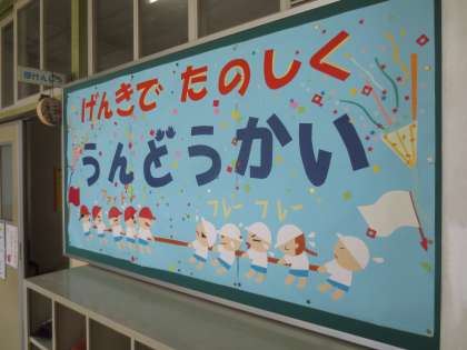 子どもたちが運動会に「元気で楽しく」参加できるよう、メッセージが掲示されています。