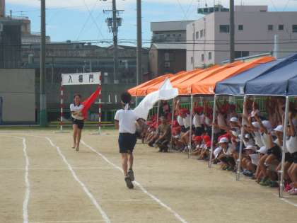9/27(火)の応援練習です。紅白応援旗をもちテント前を走りぬけていきます。みんなで力を合せて人のウェーブをつくっています。大きな声もでていました。