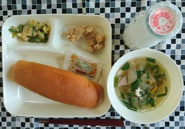 鶏肉のから揚げ、とうがんの中華スープ、キャベツと三度豆のごまあえ、コッペパン、アプリコットジャム、牛乳