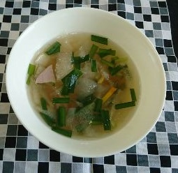 夏野菜のとうがんとハム、たまねぎ、にらなどが入ったスープです。