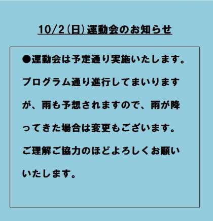 運動会は予定通り実施いたします。プログラム通り進行してまいりますが、雨も予想されますので、雨が降ってきた場合は変更もございます。ご理解ご協力のほどよろしくお願いいたします。