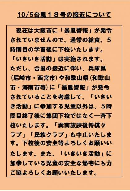 ただし、台風の接近に伴い、兵庫県(尼崎市・西宮市)や和歌山県(和歌山市・海南市等)に「暴風警報」が発令されていることを考慮して、「いきいき活動」に参加する児童以外は、5時間目終了後に集団下校ではなく一斉下校いたします。「巽南放課後将棋クラブ」「民族クラブ」も中止いたします。下校後の安全等よろしくお願いいたします。また、「いきいき活動」に参加している児童の安全な帰宅にもご協力よろしくお願いいたします。