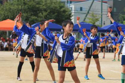5年生の「TA・MA・I・REでGO!!GO!!5!」と「YO・SA・KO・IでGO!!GO!!5!」と「リレーでGO!!GO!!5!」です。きりりとはっぴを着こなし、鳴子の音をそろえテンポよく踊れていて、とても爽やかでした。