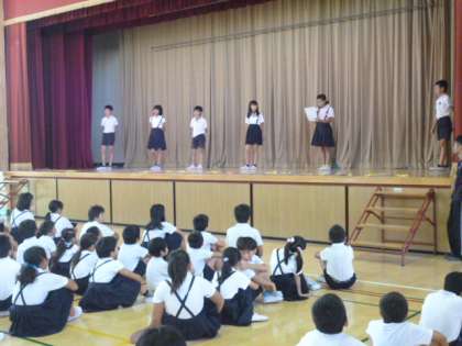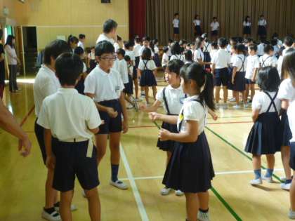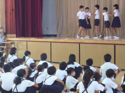 今日の集会は「ジャンケン列車」です。集会委員会の児童が説明をし、一対一のジャンケンからスタートです。