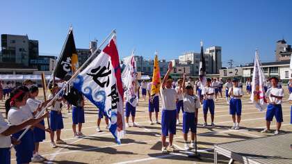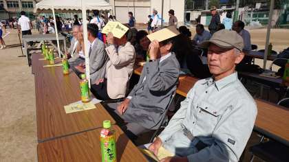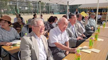 各クラスで制作したクラス旗を掲げ、生徒代表が選手宣誓をしています。ご来賓として地域の各代表の方々もたくさん来られていました。