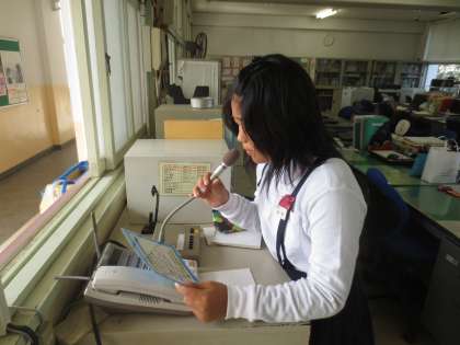 保健委員会の児童に連絡をしています。みんながしっかりと手洗いができるようにと、保健委員会の児童が毎週水曜日に手洗い場のせっけん液を補給する連絡です。