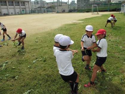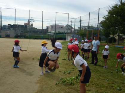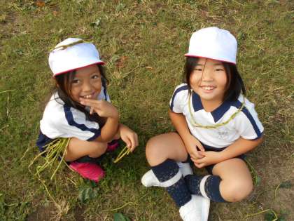 学習園の近くの芝生の上で、「つなひき」「なわとび」「かざりづくり」などで遊びました。芝生の上では、こけても痛くなかった。とても楽しかったです。