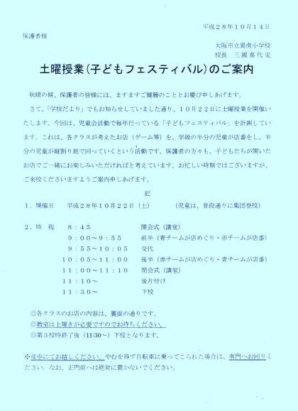 10/22(土)に土曜授業・子どもフェスティバルを開催いたします。保護者の方々も、子どもたちが開いたお店でご一緒にお楽しみください。