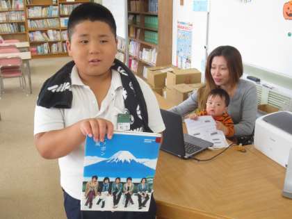図書館開放の時間、本の返却や貸出に多くの児童が図書館に来ていました。ボランティアの方がバーコードで読みとり処理してくださっています。