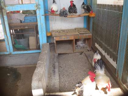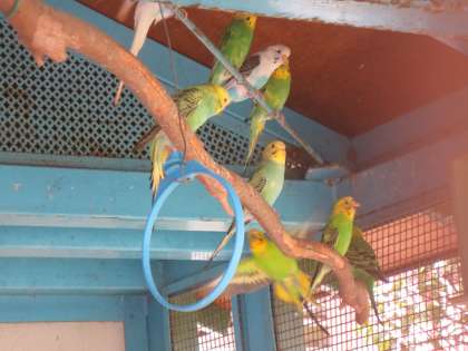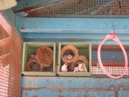 鳥小屋で暮らしている仲間たちは、チャボが10羽、セキセイインコが16羽、十姉妹が11羽います。全部で37羽が仲よく暮らしています。でも時々、セキセイインコが十姉妹の巣に入り込み、遊びなのか巣のわらを引っ張り出します。十姉妹は困った様子ですが・・・けんかはしません。
