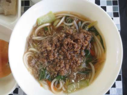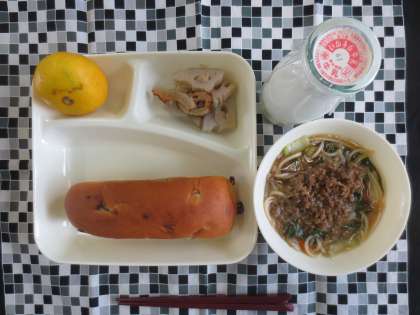 タンタンめん、れんこんのオイスターソース焼き、みかん、レーズンパン、牛乳