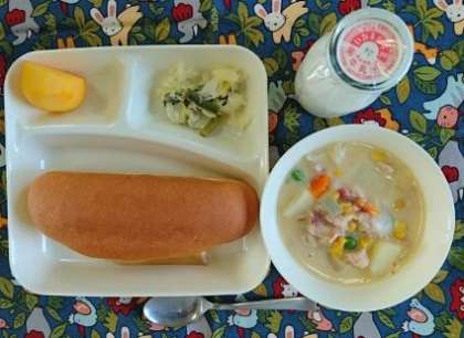 コーンクリームシチュー(米粉)、キャベツと三度豆のサラダ、かき(平核無柿)、コッペパン、はちみつ、牛乳