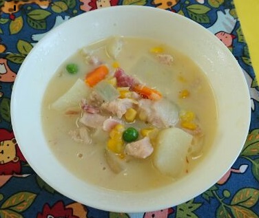 いつもは小麦粉でルウを作るシチューですが、小麦アレルギーの児童も食べられるように米粉でとろみをつけています。