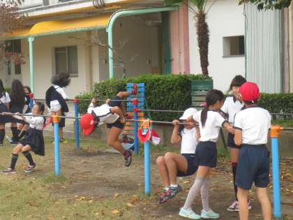 鉄棒や登り棒やジャングルジムにもたくさんの子どもたちが遊んでいます。みんな元気です。