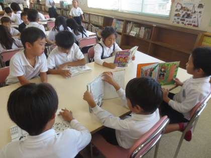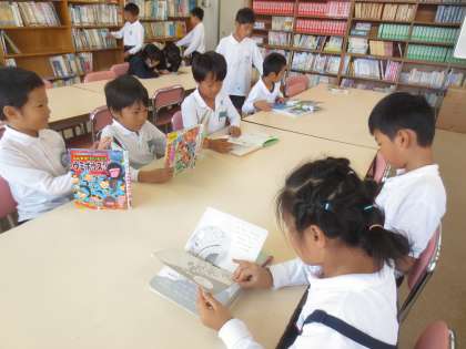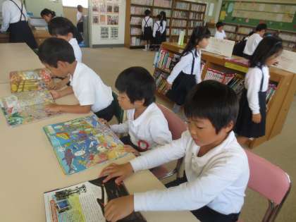 午前中は交通安全指導があり、子どもたちは運動場にでて遊べないのです。図書館には、本の返却・貸出や本を読みにくる子がたくさんやってきました。
