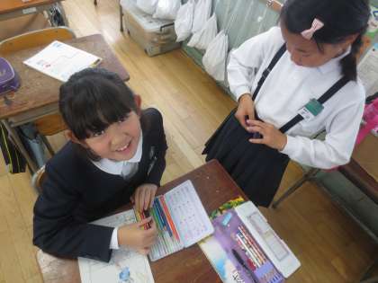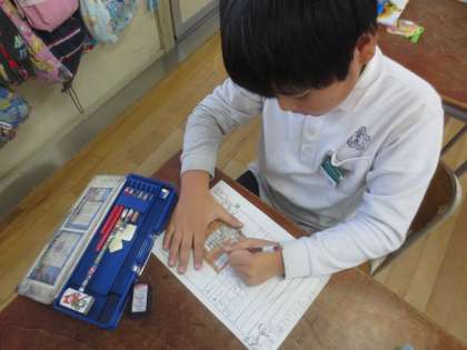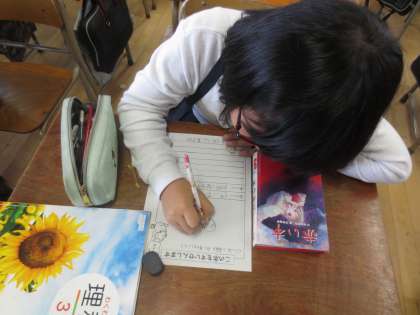 3年生の学級でも「この本をすいせんします」の用紙に、たくさんの子どもたちが絵と文をかき入れていました。