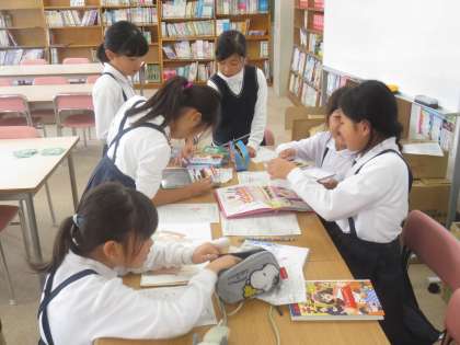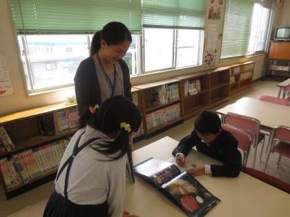 水曜日は中央図書館より図書館補助員の先生に来ていただいています。子どもたちは本の紹介に夢中になっています。