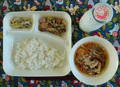 鶏肉のごまだれ焼き、ソーキ汁、チンゲンサイともやしの甘酢あえ、ご飯、牛乳