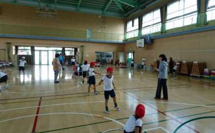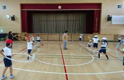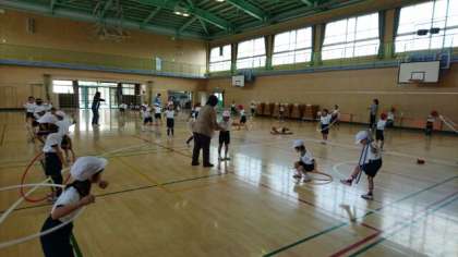 今日の20分休憩の時間に、1年生のみなさんが、はぐくみの取り組み「フラフープ」に参加しました。フラフープの経験のある子もない子も、はぐくみの方から教えてもらいながら、楽しそうにフラフープにチャレンジしていました。