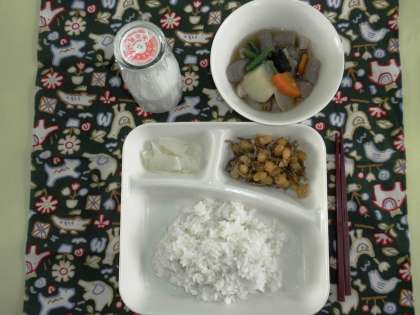 鶏肉と野菜の煮もの、じゃこ豆、かぶのゆず風味、ご飯、牛乳