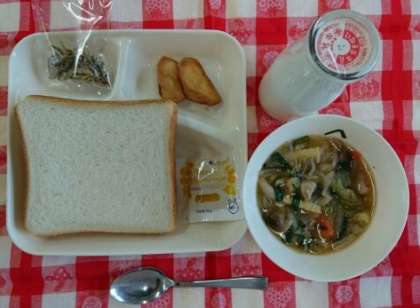中華煮、大学いも、ミニフィッシュ、食パン、マーマレードジャム、牛乳