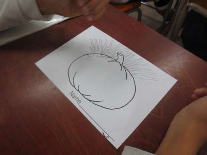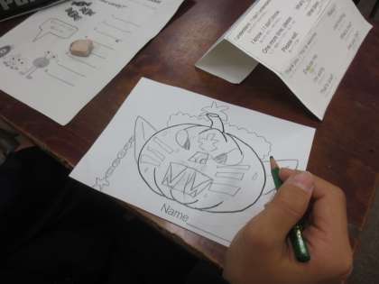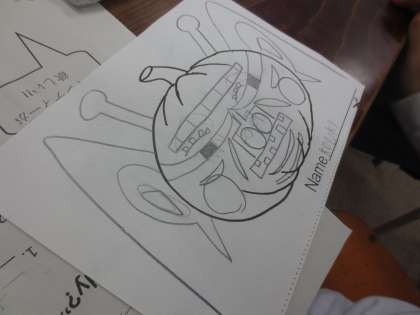 カボチャの絵に一人一人が工夫して、こわ〜い顔を描いています。