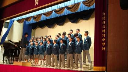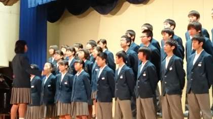 中学2年1組です。課題曲「夢を追いかけて」と「大切なもの」の合唱発表です。