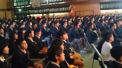 中学1年1組です。課題曲「夢を追いかけて」と「遠い日の歌」の合唱発表です。