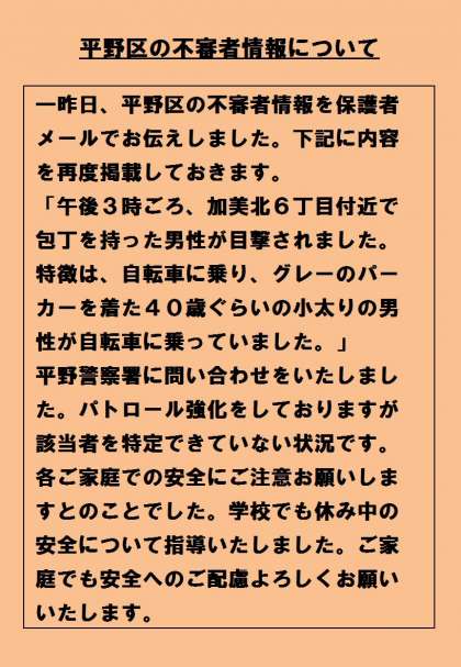 平野警察署に問い合わせをいたしました。パトロール強化をしておりますが該当者を特定できていない状況です。各ご家庭での安全にご注意お願いしますとのことでした。学校でも休み中の安全について指導いたしました。ご家庭でも安全へのご配慮よろしくお願いいたします。