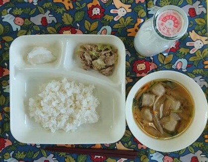 豚肉とまいたけのいためもの、つみれ汁、ういろう、ご飯、牛乳