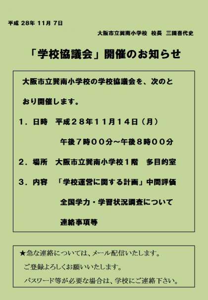 大阪市立巽南小学校の学校協議会を、次のとおり開催します。
