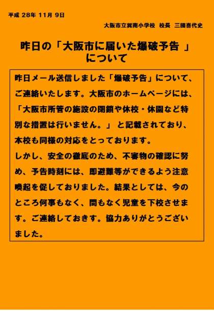 昨日メール送信しました「爆破予告」について、ご連絡いたします。大阪市のホームページには「大阪市所管の施設の閉鎖や休校・休園など特別な措置は行いません。」と記載されており、本校も同様の対応をとっております。しかし、安全の徹底のため、不審物の確認に努め、予告時刻には、即避難等ができるよう注意喚起を促しておりました。結果としては今のところ何事もなく、間もなく児童を下校させます。ご連絡しておきます。ご協力ありがとうございました。