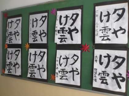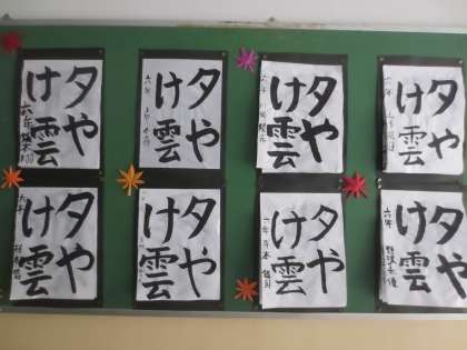 4階に6年生の習字が掲示されています。ゆっくりと力強く「夕やけ雲」が書かれています。学級にもしっかりと書かれた「夕やけ雲」の習字が掲示されています。