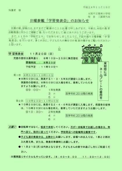 今日、日曜参観「学習発表会」のお知らせを配布いたしました。子どもたちが講堂の大きな舞台での発表いたします。一生懸命に取り組む姿にきっと感動されることと思います。当日、多くの方々のご来校をお待ちしております。