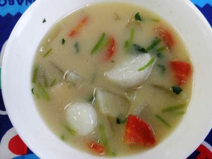 正月の行事献立です。金時にんじん、さといもが入り白みそ仕立てのぞう煮です。