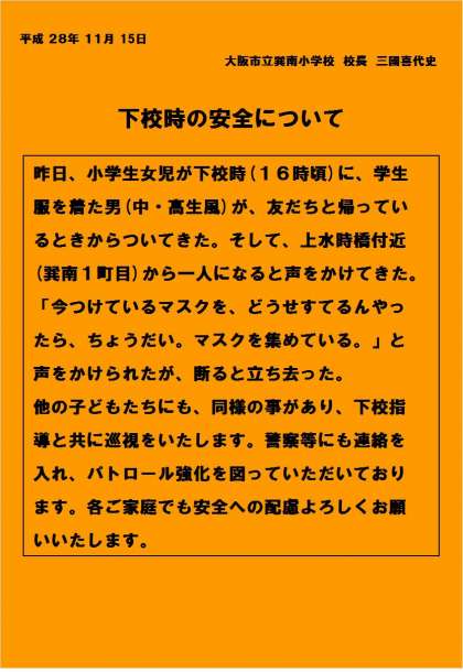昨日の下校時、児童が不審な男に声をかけられた。「今つけているマスクを、どうせすてるんやったら、ちょうだい。マスクを集めている。」と声をかけられたが、断ると立ち去った。他の子どもたちにも、同様の事があり、下校指導と共に巡視をいたします。警察等にも連絡を入れ、パトロール強化を図っていただいております。各ご家庭でも安全への配慮よろしくお願いいたします。