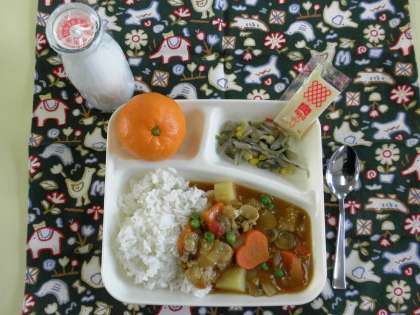 ポークカレーライス、ごぼうサラダ、みかん、牛乳