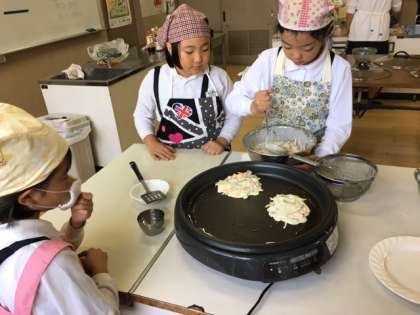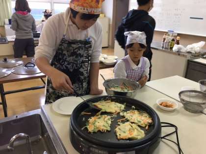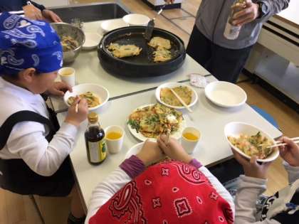 11月16日(水)民族クラブの時間に、子どもたちは「チジミづくり」にチャレンジしました。チジミの具には、タマネギ、ニンジン、ニラ、キムチ、イカを使いました。みんな協力して作りました。焼き上がったチジミを食べたときは、とてもおいしかった。手伝いに来た先生とも一緒に食べました。とても楽しかったです!