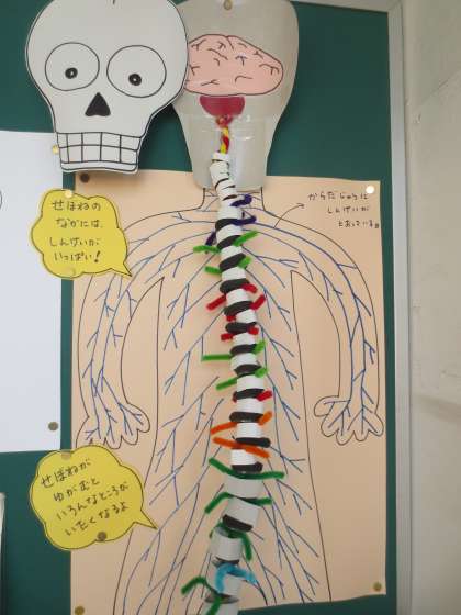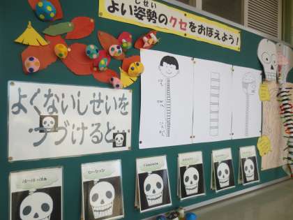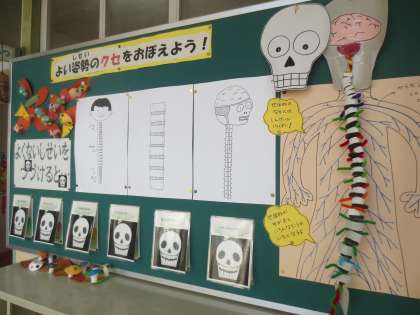 姿勢について背骨との関係を絵でわかりやすく説明しています。自分の身長を測り成長を確かめ、掲示を見て背骨の大切さも知ってほしいです。