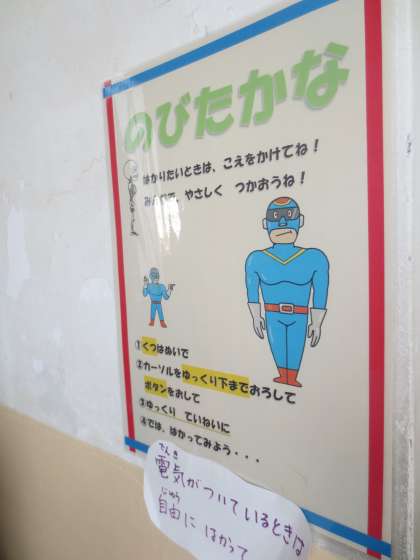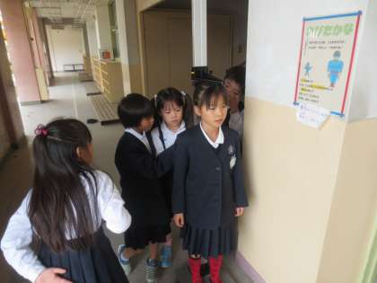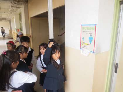 保健室前に置いてある身長計で、子どもたちが自分の背たけを測っていました。