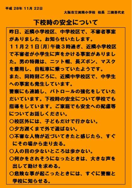 警察にも連絡し、パトロールの強化をしていただいています。下校時の安全について学校でも指導をしています。ご家庭でも安全への配慮等についてお話しください。