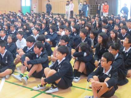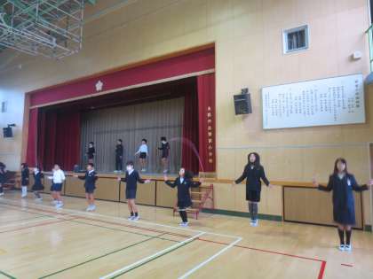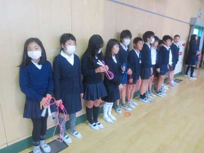 朝、なわとび集会がありました。昨夜の雨で運動場が使えなかったので、体育館に集まり運動委員会の児童が模範跳びを見せました。
