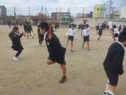 みんなでリズム縄跳びをした後は、一人一人が技にチャレンジしています。