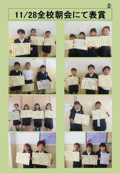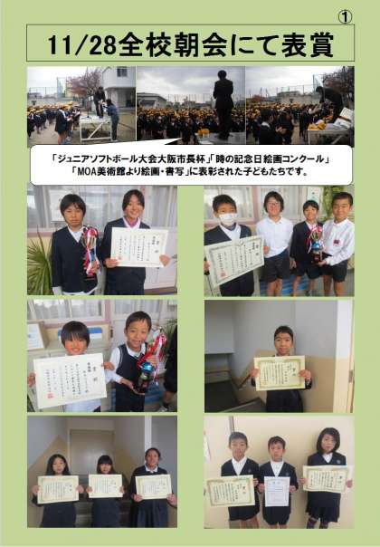 全校朝会にて、「ジュニアソフトボール大会大阪市長杯」「時の記念日絵画コンクール」「MOA美術館より絵画・書写」より表彰状をいただいた子どもたちを紹介し、全児童の前で表彰式を行いました。みなさんからは大きな拍手がおくられていました。