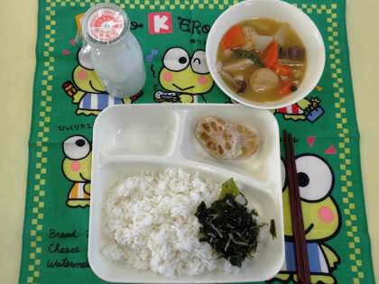 鶏肉と一口がんもの煮もの、れんこんのてんぷら、じゃこわかめ、ご飯、牛乳
